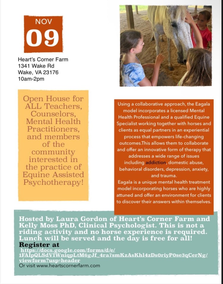 Any of my Teacher, Counselor, Mental Health Professional friends interested in finding out what Equine Assisted Therapy is all about? Hearts Corner Farm and Kelly Moss, PhD, Clinical Psychologist team up to offer an Open House for anyone interested in this exciting therapeutic modality! Come join us for a day of hands on activities with the horses as we explore the way that they are uniquely suited to help your clients and the whole community! The day is free of charge to all practitioners and lunch will be served. The open house will be held November the 9th from 10am-2pm. Reservation link and additional information will be posted at www.heartscornerfarm.com. Help us lead the way for Horses Helping People in our community!